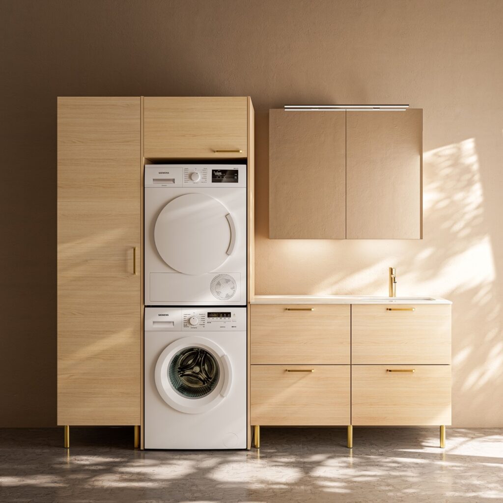 Kun pesukone nostetaan oikealle korkeudelle ja ympärille rakennetaan harkittu säilytys, arki helpottuu. Samalla tila näyttää siltä kuin sen kuuluukin: suunnitellulta, ei sattumanvaraiselta.
