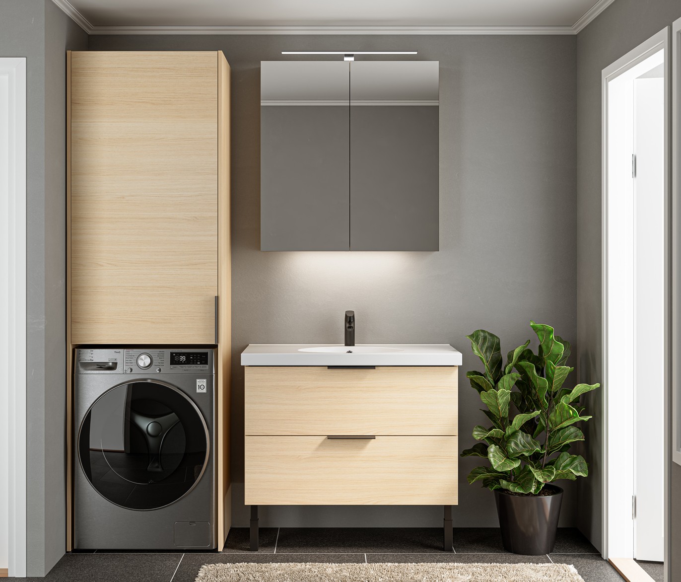 Suomalainen kylpyhuone on usein pieni mutta vaativa tila. Samassa tilassa pitää mahtua peseytyminen, säilytys – ja usein myös pesukone.