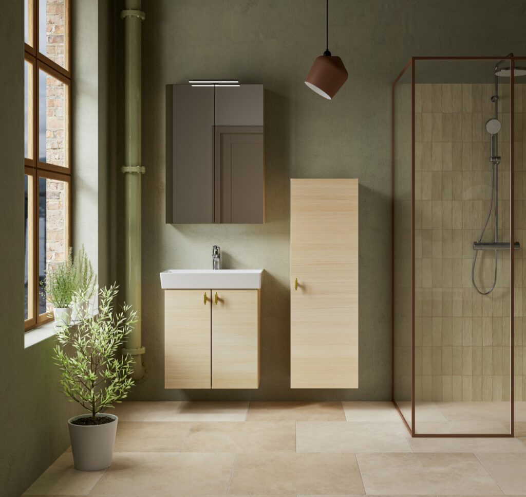 AURA on allaskaappi pieneen kylpyhuoneeseen, jossa tila on rajallinen ja budjetti tarkka – mutta tyylistä ei tingitä. 35 cm syvyys tekee liikkumisesta sujuvaa ja jättää tilaa arkeen.