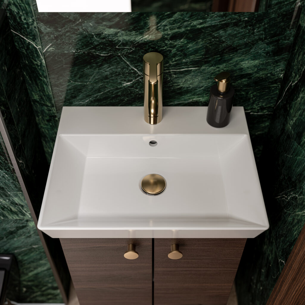 AURAn kalusteen syvyys on vain 35 cm, ja posliinialtaan syvyys 40 cm. Kolme leveyttä – 50, 60 ja 70 cm – mahdollistavat tasapainoisen kokonaisuuden niin kerrostalokylpyhuoneeseen kuin kompaktiin kodinhoitotilaan.