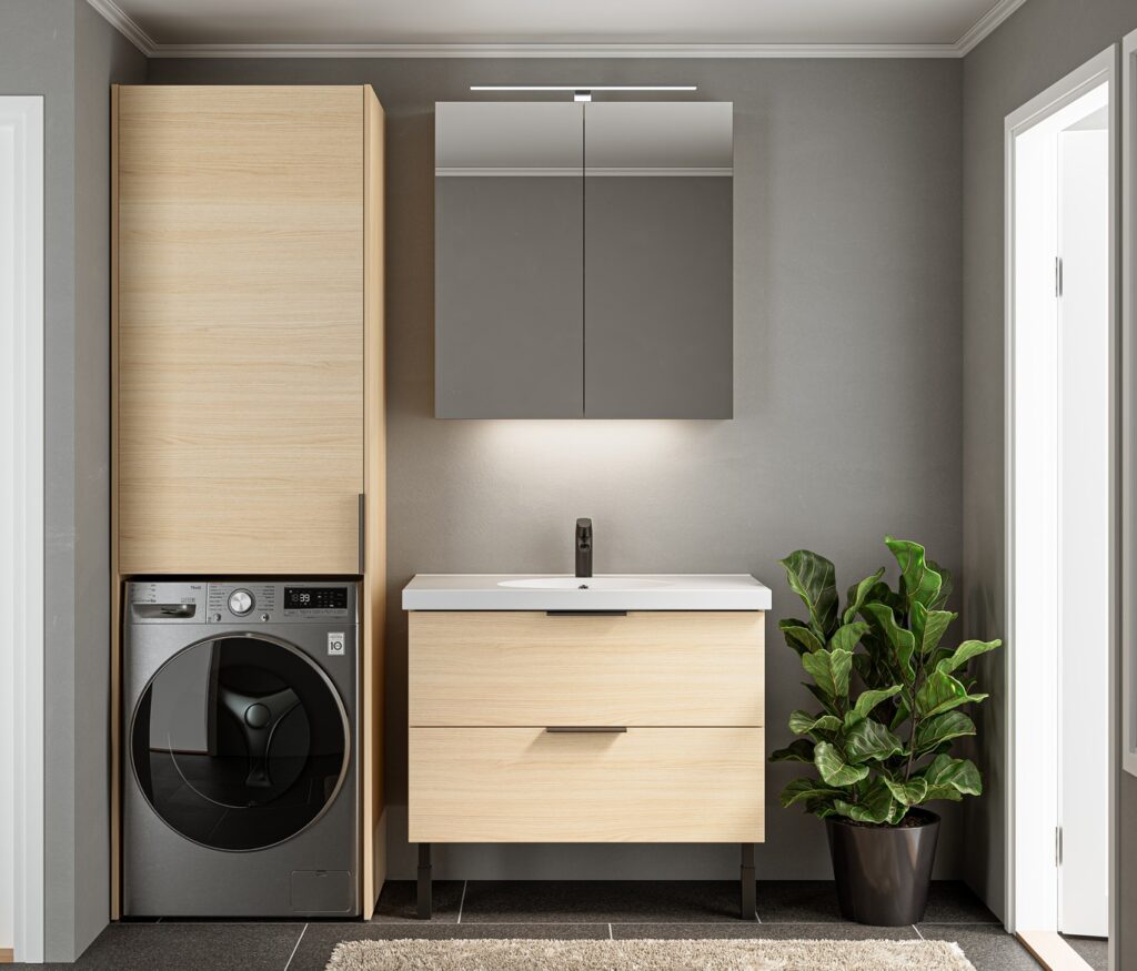 Allaskaapit, peilikaapit ja säilytysratkaisut muodostavat yhteensopivan kokonaisuuden – mitoitus, linjat ja sävyt valmiiksi ratkaistu.