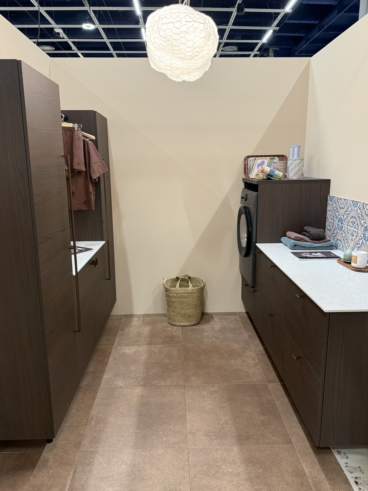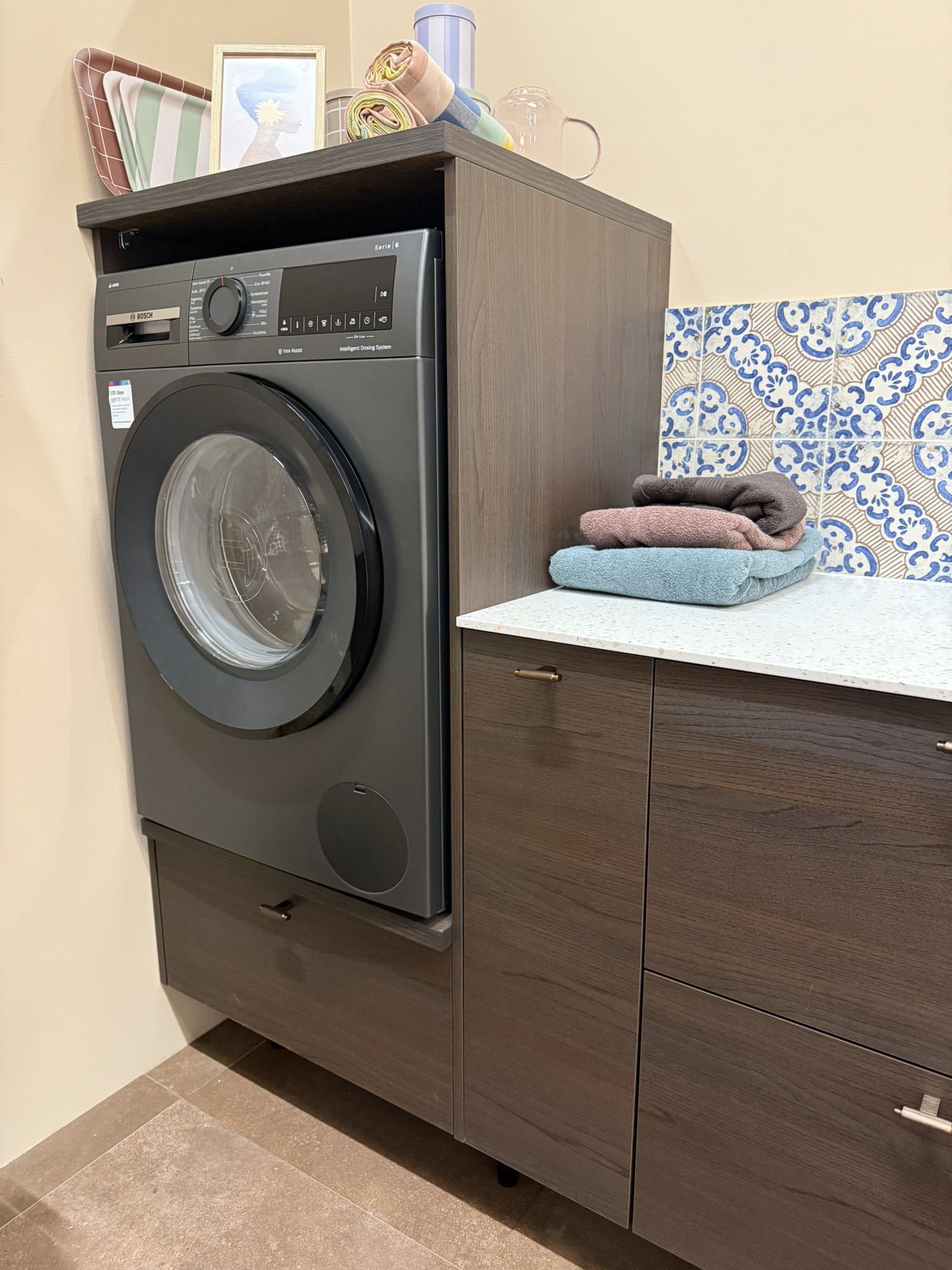 Kodinhoitohuoneen sisustus huutaa ratkaisuja, joiden keskiössä ovat pesukone, pesukonekaappi ja pesukonekalusteet!