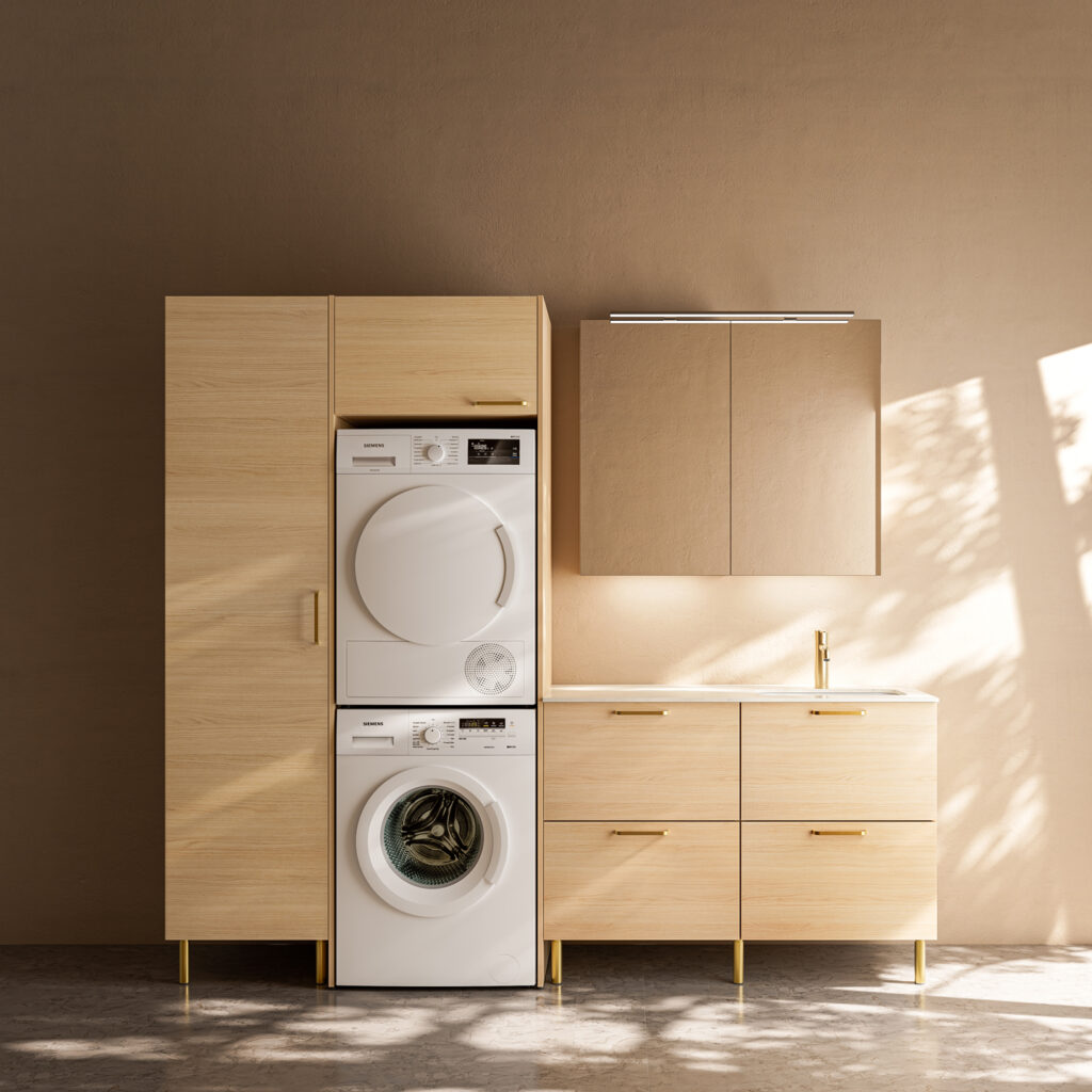 Suomalaisissa kodeissa kylpyhuone ja kodinhoitohuone ovat usein yksi ja sama tila. Siksi ratkaisut pitää suunnitella älykkäästi: saman katon alla pitää mahtua pesemään, viikkaamaan, säilyttämään, hengittämään – ja ehkä vähän nauttimaankin.
