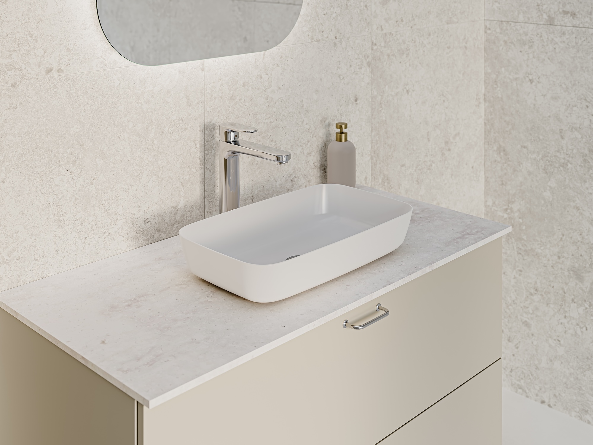 -Helsinkiläisen lapsiperheen kylppärin uudistuksessa näkyi hienosti lämpimän greigen värin parhaat puolet. Se tuo kivasti lämpöä pesutiloihin ja sopii suomalaiseen spa-tunnelmaan. Allas- ja peilikaappi on tehty samoista materiaaleista ja ne saa saman levyisinä, joten kokonaisuus on kompakti ja käytännöllinen.