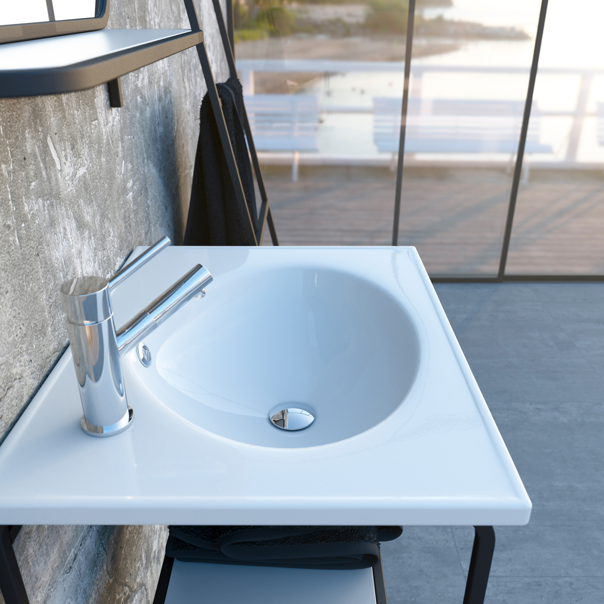 -Musta väritys jatkuu wc-tilassa, johon toivottiin runsaasti lasku- ja säilytystilaa. Helppohoitoinen, tyylikäs kokonaisuus toteutettiin seinästä seinään ulottuvalla kalusteella ja malja-altaalla. Pyöreä valopeili tuo mukavasti muotoa tilaan. Sen takaa heijastava taustavalo luo tunnelmaa ja samalla tarjoaa kylppäriin sopivaa puhdasta 4000 K valoa.
