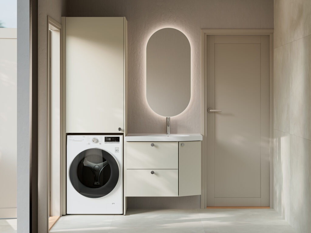 Pesukone integroituna osaksi kalustetta ja sen yläpuolella isossa kaapissa runsaasti tilaa pyyhkeille, pesuaineille ja muille kylpyhuonetarvikkeille. Saatavana kolmessa eri syvyydessä pesukoneen syvyyden mukaan: 45. 50 ja 60 cm. Ja jotta tyylistä ei tarvitse tinkiä: kaikki vakiovärit samaan hintaan.